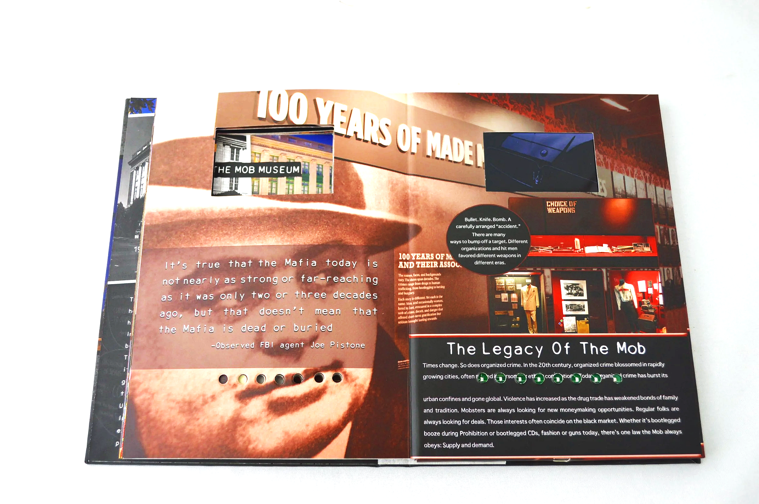 The Mob Museum video book was technically the most challenging project we ever worked on. The book features a hardbound cover and 16 pages of internal content. The interiors were brilliantly created by Matt Crist, one of our best graphics designers. Images and video content were captured by Max Ellis, who also edited all of the video b-roll into short vignettes narrated by former Las Vegas Mayor Oscar Goodman.